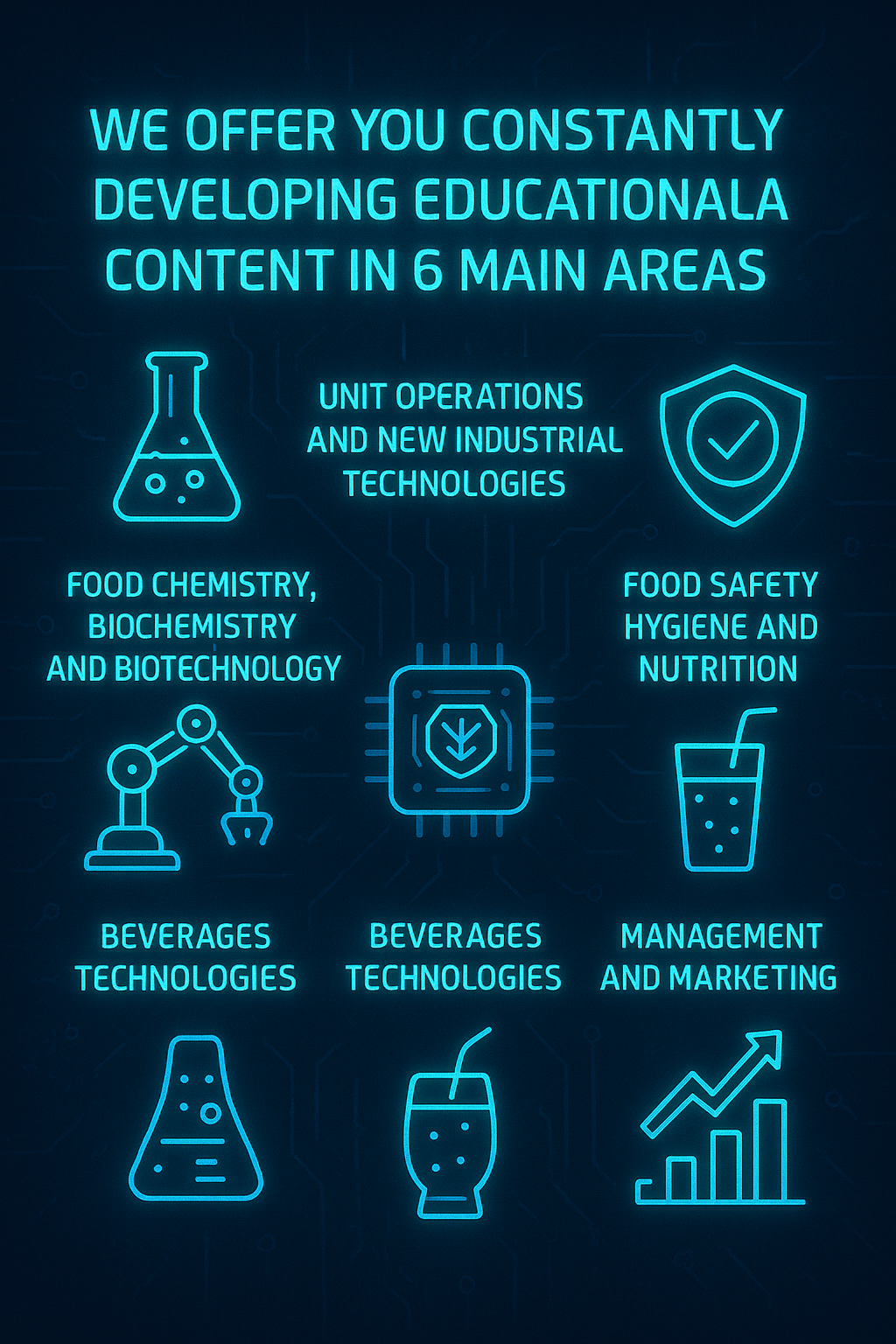 The second main goal of our project is to create educational content that will help students participating in the project develop their case studies by getting acquainted with different technologies, systems, innovations, marketing strategies, etc. We offer you constantly developing educational content in 6 main areas: Food chemistry, biochemistry and biotechnology; Unit operations and new industrial technologies; Food safety, hygiene and nutrition; Food technologies; Beverages technologies; Management and marketing. The educational content of these courses will be updated periodically during the implementation of the project and after its end. |